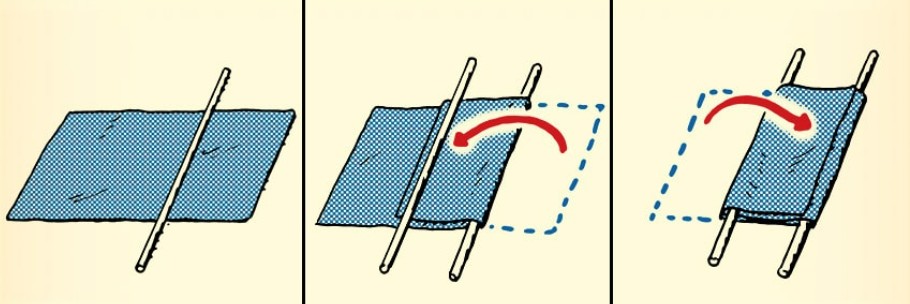 På tur har en kanskje en presenning/tarp i sekken til å lage en kjapp gapahuk. Den kan du også bruke til å lage båre! Legg den utover på bakken. Så plasserer du den første rajen ca. 1/3 inn på duken. Brett presenningen over, og legg den andre rajen oppå (se over). Så bretter du den andre enden av presenningen over den samme rajen. Det er ikke nødvendig å feste dette noe mer; vekten av den som ligger på båra vil holde presenningen på plass. I stedet for presenning kan du også bruke et pledd.