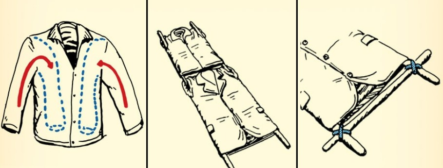 Jakke er noe alle har med på tur. Ved hjelp av to eller tre jakker kan en lage en kjapp og enkel båre. Her må du først sage eller hogge ned et par rajer, ca. 2 meter lange. Du kan også bruke et par årer, gjerdestaur, kraftige planker eller til og med ski. Så vrenger du ermene inn i jakka (se over), og trer rajene gjennom. I hver ende kan du stive av båra ved å surre fast to korte pinner.